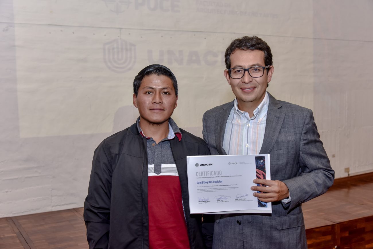 Durante la firma del convenio, UNACEM Ecuador entregó a su estudiante más destacado de la Escuela de Formación Selvalegre, una beca completa para cursar la “Tecnología Superior en Construcción”, impartida en la PUCE, cuyo objetivo es incidir en la profesionalización de los obreros del sector de la construcción.